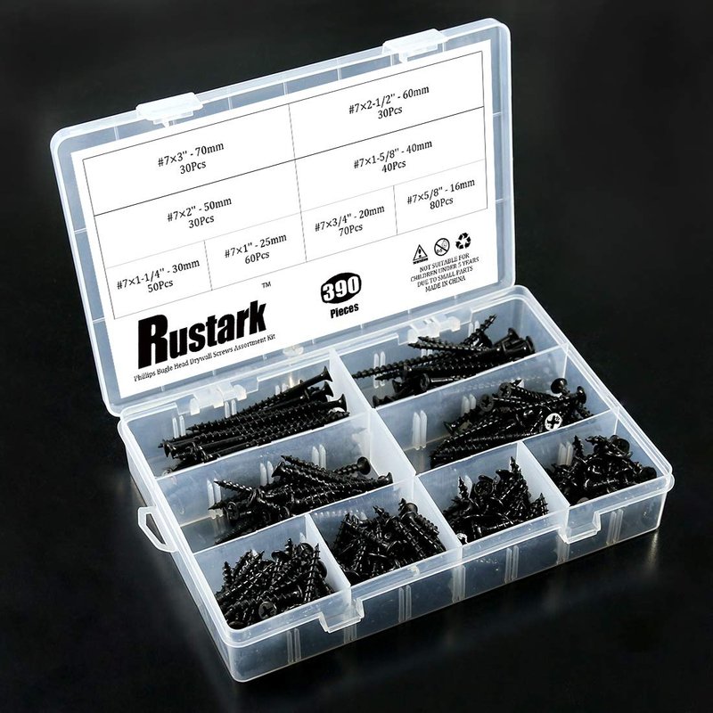 Rustark 390-Pcs #7 Coarse Thread Drywall Screw with Phillips Drive Black Oxide Finsh Bugle Head Wood Screws Assortment Kit Ideal for Drywall Sheetrock
