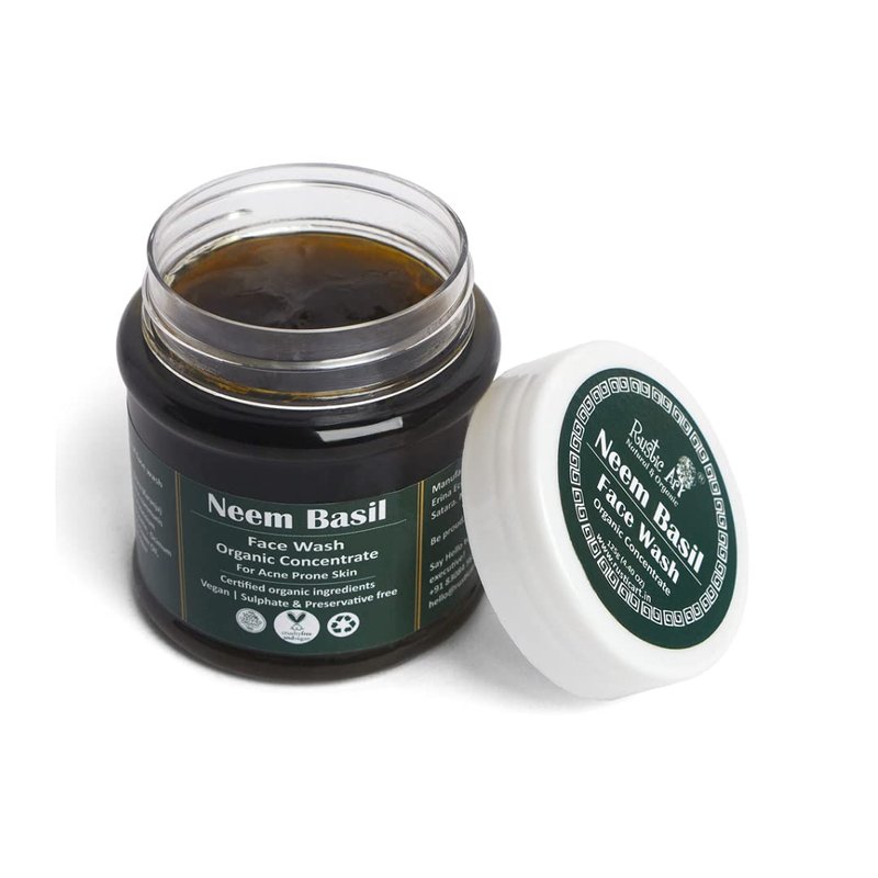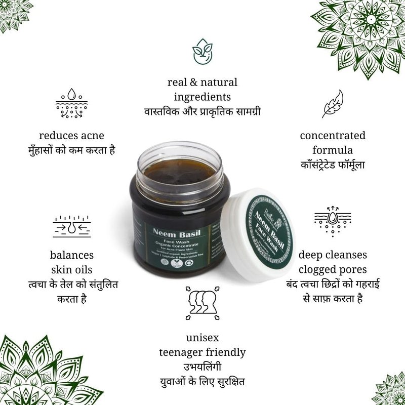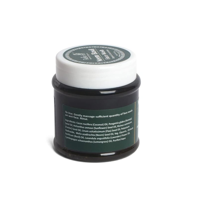 Tired of waking up to angry acne? We've got you covered! Neem & Basil are the perfect 'chill'. It is reinforced with soothing & calming Lavender, & Lemongrass organic essential oils. Neem basil face wash is organic, natural and vegan mild clenaser suitable for oily to normal & acne prone skin. It serve many purposes including protection against pollution, anti bacterial and anti fungal wash, and provides a deep cleansing experience. Our facewash concentrate lasts up to three times longer than the liquid of same quantity. Contains no sulphates, phosphates, parabens, synthetic colours and fragrance. Compact packaging, non leaking, travel friendly. All the ingredients used to hand blend this product are certified organic. Water Efficient: Requires less water to rinse off. To Use: Scoop out small quantity of face wash and lather with water. Massage. Rinse. Avoid contact with eyes.