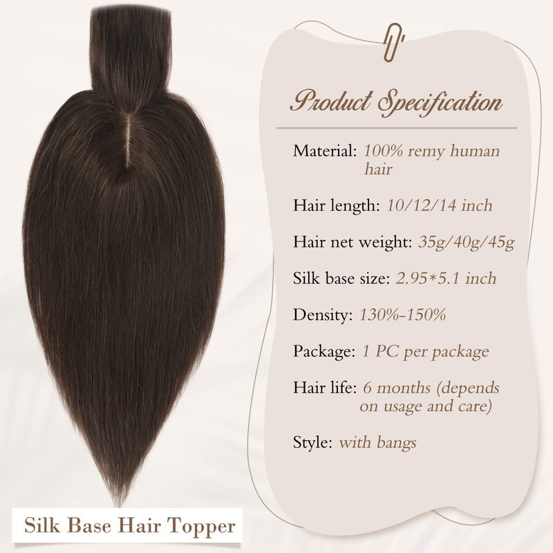 - Handmade Topper Hairpiece: Can be washed, straightened, curled, bleached or dyed, note that the middle part is Silk base structure, not to be rubbed hard to avoid damaging the structure and causing hair fall. Normally silk base crown topper hair extensions is without shedding and tangling.
