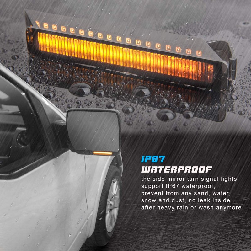 - FLOWING LED LIGHTING DESIGN: Equipped with 48 LED, amber LED strip and flowing mode give your truck a much cleaner look, super bright light output maximize driver and passenger sides illumination, a best replacement for the old or burnt out factory side mirror turn signal light