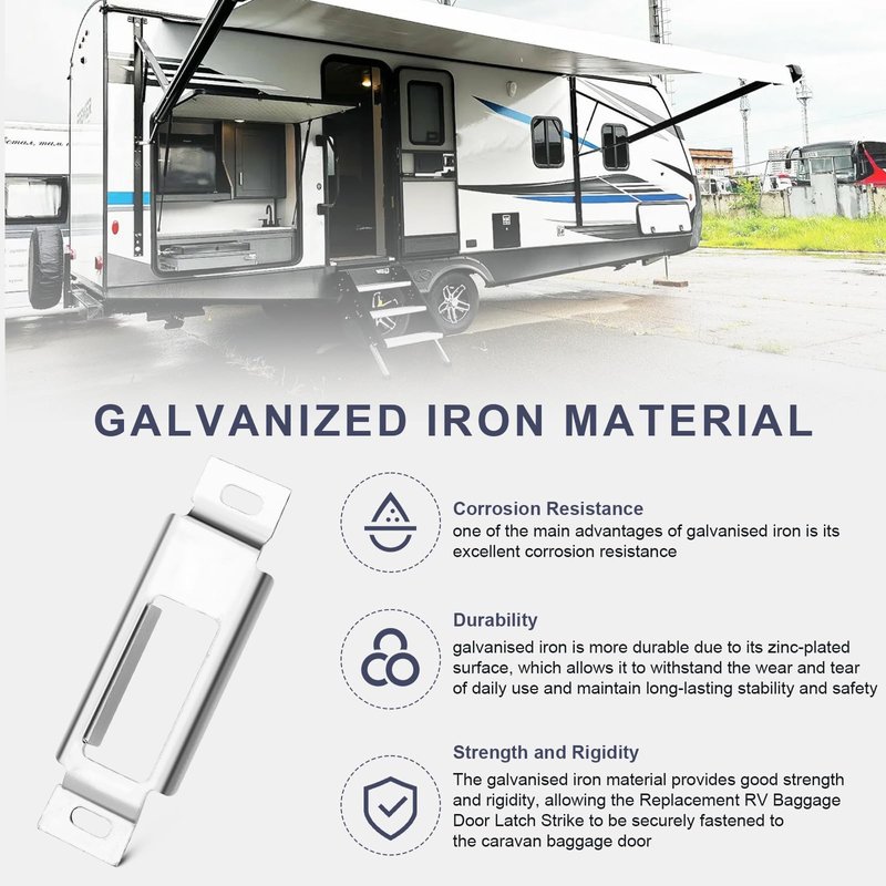 - √ Galvanized Iron Material: Iron galvanised is corrosion and abrasion resistant and provides good strength and rigidity to enable the replacement rv luggage door latch strike plate to be securely fixed to the rv luggage door