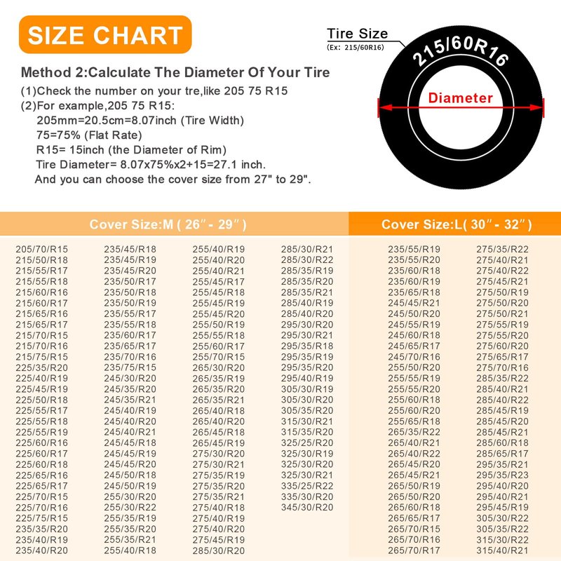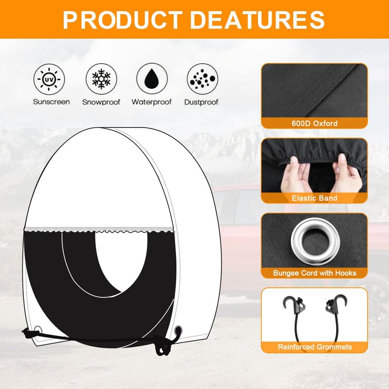 - 【Wind Resistant Tire Cover】Elasticized back hem and hook design for a secure fit. The cord keeps the tire cover stay on the wheel even on windy days. Easy to install and remove.