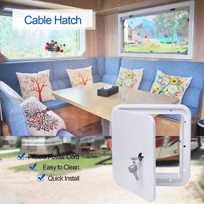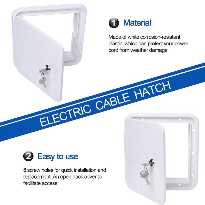 - [Compatible]: Electric Cable Hatch with 2 Keys Compatible with RV Electric Cord Hatch W 8 inch.Non-original parts.The part/product is not sponsored or endorsed by,or affiliated with the brands it fit,including RV Electric Cord Hatch W 8 inch, H 8-1/2 inch.
