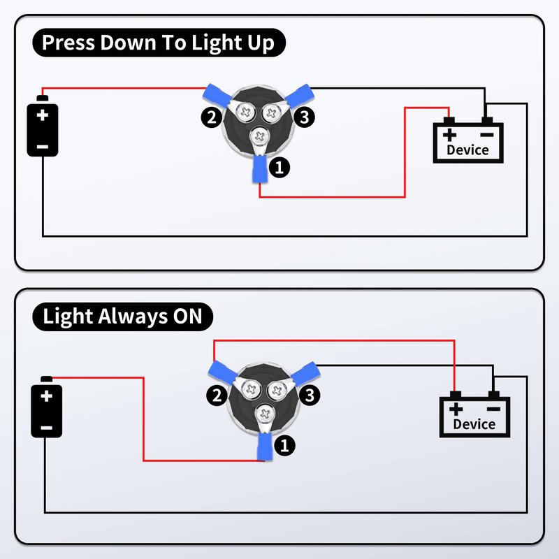 - 【Red LED】The red LED light can clearly see the surrounding environment in the dark. You can select different wiring methods to determine the lighting mode, such as pressing down the push button starter switch light up or LED light always on