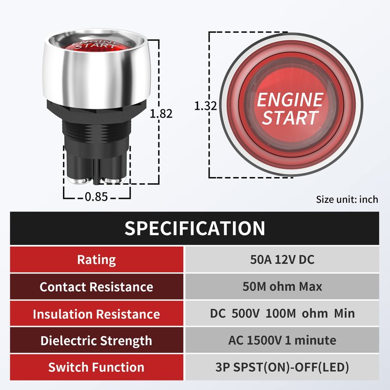 - 【Heavy Duty】12 VDC 50A push start ignition switch, the start switch only needs to press the button for a moment to start the vehicle