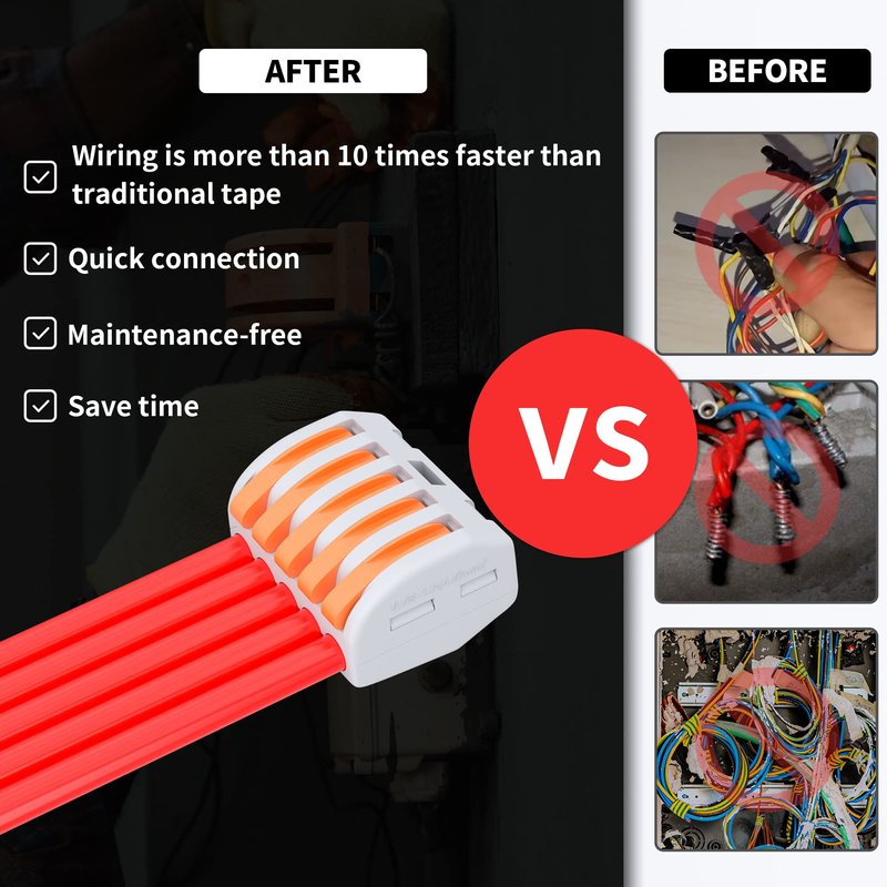 - 【Higher Efficiency】These push-in wire connectors just push the orange handle to 90 °,insert the cable and close the switch. No tape winding, saves a lot of time and effort.