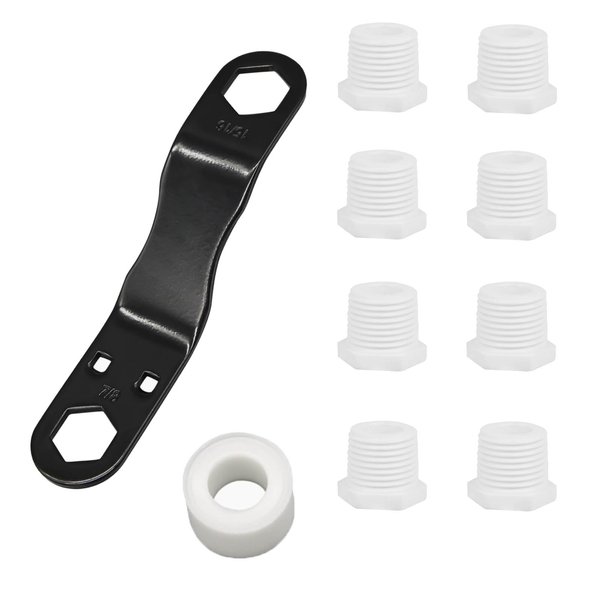 RVPNR RV Water Heater Drain Plug Kit, Include Angled Wrench, 8 Pieces 1/2" NPT Replacement Plugs and 1 Roll PTFE Tape.