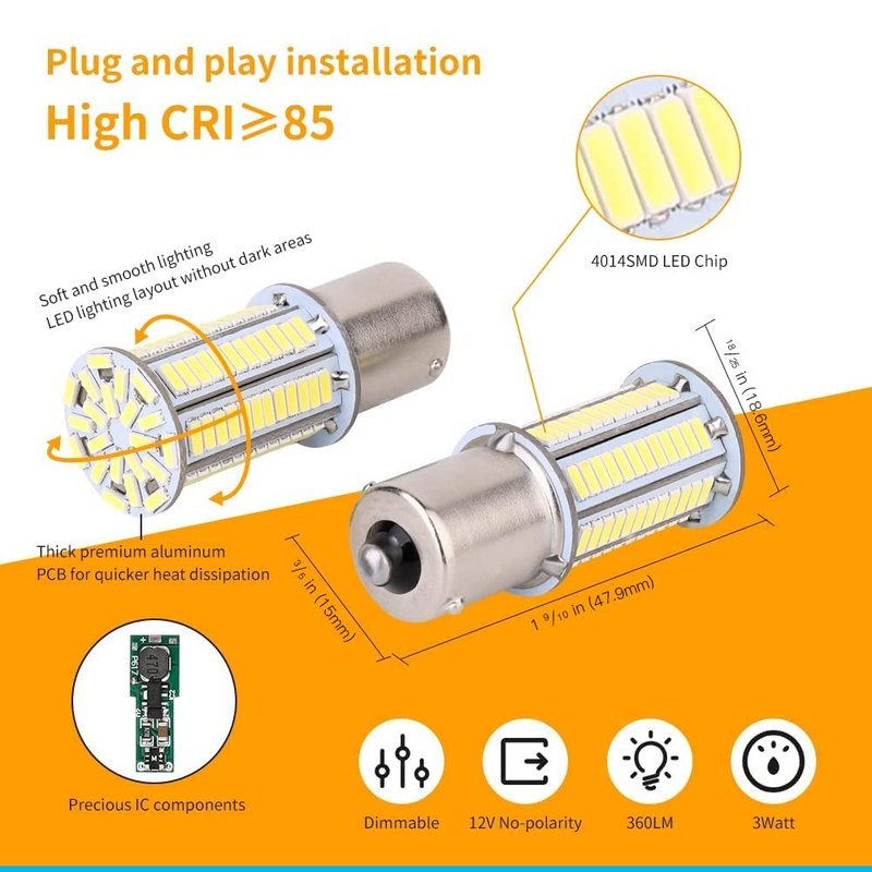 - 【Specification】 4pcs 1156 4014 105-SMD LED, Length:1.88” 47.9mm, Diameter: 0.73” 18.6mm , 6000K White light, 360lm per bulb, Voltage: 12V, Wattage: 3w.