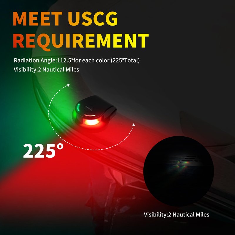 - 【Meets USCG requirement】:This LED boat navigation lights adopt new optical design with 21 bulbs in each lamp, meeting the USCG requirement of 2 nautical miles visibility. The power of boat running light is only 1.2W, which is power saving and long lasting life.