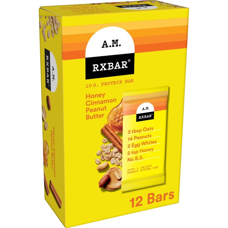 - Includes one, 23.2oz box containing 12 RXBAR A.M. Honey Cinnamon Peanut Butter protein bars