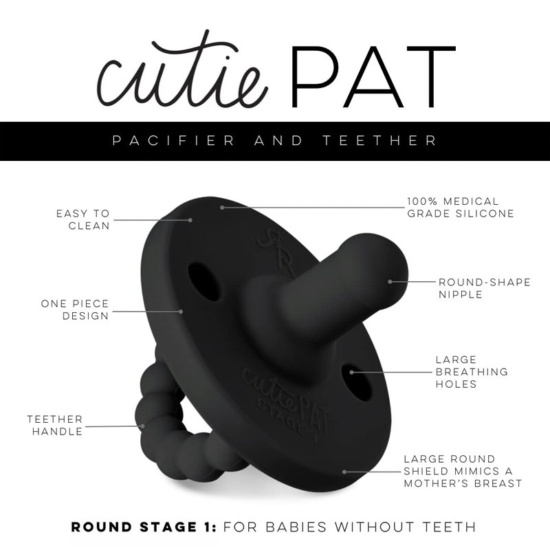 Cutie PAT | Pacifier And Teether | Stage 1: For babies without teeth | Made with 100% medical grade silicone | Neutral Colors: Matches babies outfits | Designed in the USA | Made in China | Pacifier ROUND soft nipple | ONE piece design | LARGE round shield | LARGE breathing holes | Teether DESIGN feels good on baby's gums | NIPPLE pops in while being used as a teether | HANDLE makes it easy for baby to hold and place in mouth Our Cutie Pat comes in two stages Stage 1: recommended for babies without teeth Stage 2: recommended for babies with teeth DIRECTIONS Before first use, remove product from packaging. Wash with soap & water. Let air dry. Dishwasher safe, top rack only. Inspect before each use, especially once baby has teeth. Discard at immediate sign of damage. Nipple should be sucked on, as a means to soothe, not chewed. While using as a teether, pop nipple in before use. For safety it's recommended to replace after 4 weeks of use. Do not use without adult supervision. Do not tie around a child's neck. Colorful foods, dyes and/or other liquids may cause discoloration and staining. PATENTED. WARNING: To avoid a choking hazard, inspect before each use, especially once baby has teeth. Discard immediately at sign of damage. Nipple should be sucked on as a means to soothe, not chewed. While using as a teether, pop nipple in before use. For safety it’s recommended to replace after 4 weeks of use. Do not use without adult supervision. Do not tie around a child’s neck.