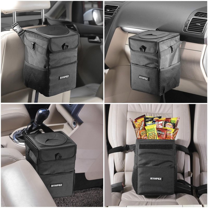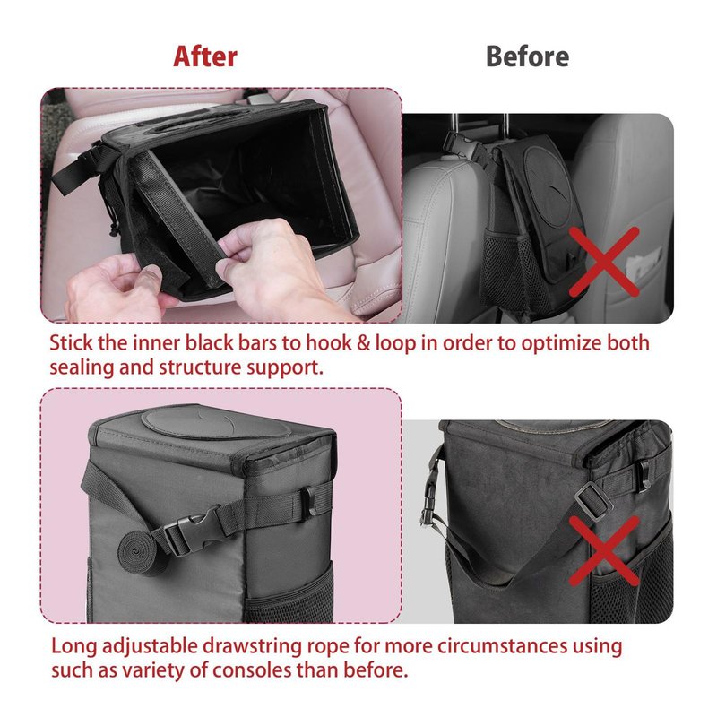 - We've made massive improvements from voice of customers: 1. Structure Support - In order to keep the car garbage can staying in shape from collapsed, just attached two black side bars to hold its shape. The bars also optimize sealing to keep everthing inside. 2. Extra Long Adjustable Strap - We doubled the length of the nylon strap, so that allow this car accessories to hang on the front or back seats, most type of consoles, even anywhere you want in car.