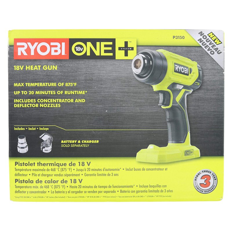 The Ryobi P3150 cordless heat gun offers easy and portable high temperatures. In only 10 seconds this heat gun will be at operating temperature. This will save you time and battery power! The max temperature of this heat gun is 875 degrees Fahrenheit. These temperatures will help with heating shrink wrap, shrink tubing, or drying joint compound. There are also two included nozzles. The deflector nozzle has a hook design to help jobs with heating shrink tubing or helping pipes thaw. The concentrator nozzle will help intensify the heat in more specific spots. Part of the 18v ONE+ system, this tool will fit any battery in the Ryobi One+ family. This heat gun will run for up to 20 minutes when paired with the Ryobi P193 18V 6Ah battery (battery not included). There is also an included LED light that illuminates your workspace when the heat gun is in use. This Ryobi heat gun will help make your drying and shrinking needs possible.