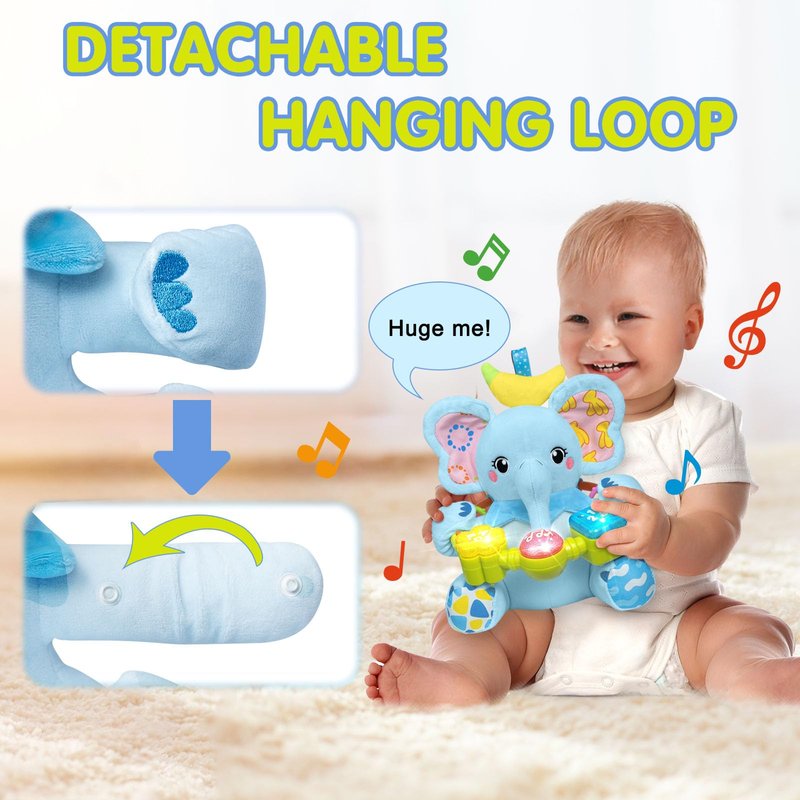 - BABY MUSICAL TOYS: The cute elephant baby toy features three buttons, each with different music effects, including numbers 123, letters ABC,and 7 soothing baby songs. Pressing each button activates different sounds and lights, capturing the baby's curiosity and attention while helping to soothe them to sleep. Designed for babies aged 0-6-12 months, it enriches their sensory experience.Promote gross motor and tactile skills