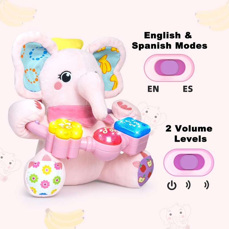- BILINGUAL TOYS FOR BABY: This tummy time toy switches between English and Spanish to learn different music, numbers and letters with the baby elephant toy. This helps to build your baby's early language learning skills in a different and fun way, promoting cognitive development for babies 0-6 months and language learning skills for babies 6-12 months
