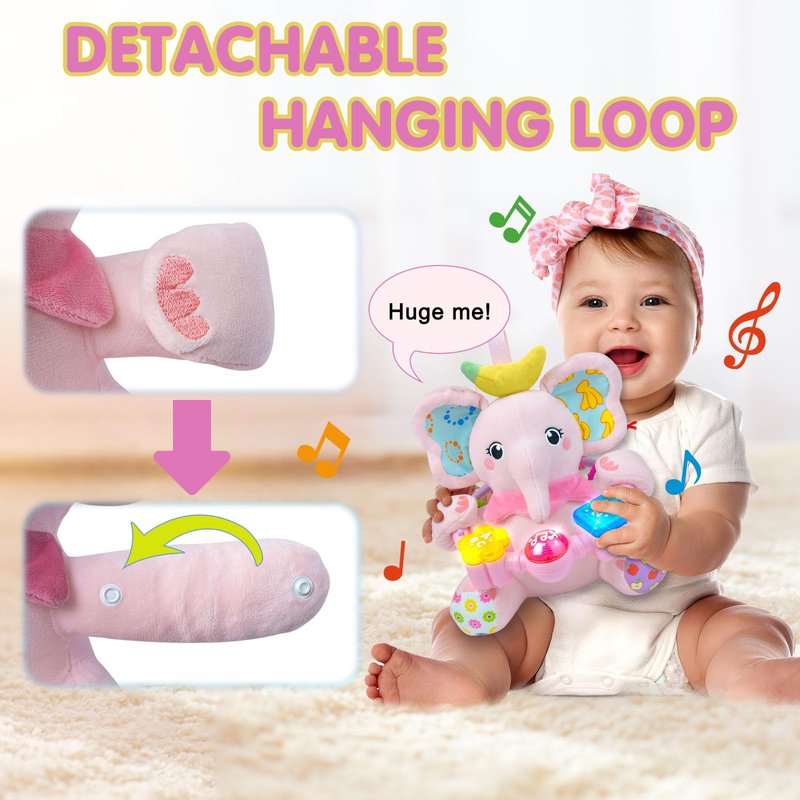 - BABY MUSICAL TOYS: The cute elephant baby toy features three buttons, each with different music effects, including numbers 123, letters ABC,and 7 soothing baby songs. Pressing each button activates different sounds and lights, capturing the baby's curiosity and attention while helping to soothe them to sleep. Designed for babies aged 0-6-12 months, it enriches their sensory experience.Promote gross motor and tactile skills
