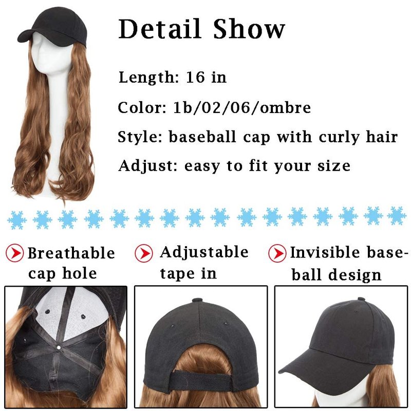 Product Features Item type: Baseball Cap With Hair Styles: Long Wavy / Corn Wave Hair Extension Hair Type: Cosplay Hair/Patient Hat Hairpiece/Cap Hair Extension for Women Hair Color: Black / Brown / Blonde / Ombre, 7 color available Material: Heat Resistant Synthetic Fiber Wig Length: 16”-Curly, 18”-Corn Wave Weight: About 320g Items/package: Cap With Hair as whole Hat Detail The Color is the hat is black, The diameter of the cap is about 6.5 Inches (minimum condition,can be adjusted), Brim Width: 3 Inches, The height of cap: 5 Inches How to wear the hair extension? 1 Comb your hair in a natural condition or you also could make a low ponytail; 2 Put on the cap and adjust the velcro tape to fit your size; 3 Blend the extension with your hair well 4 Make a ponytail or braid it as you like 5 finish