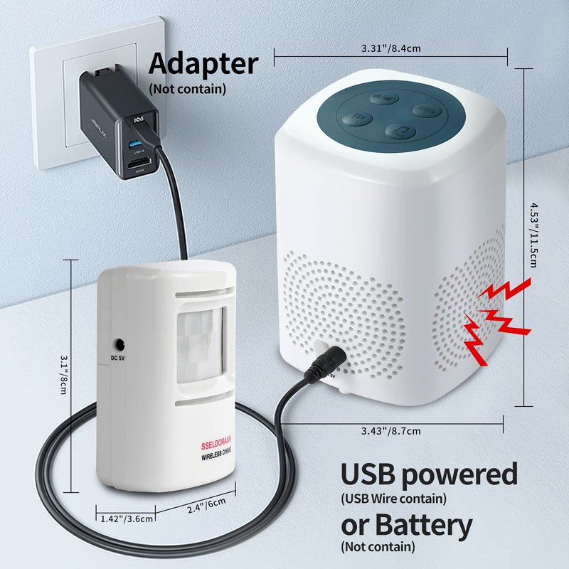 - 【PLUG&DC Both powered】-Power on the motion sensor by 3pcs AA 1.5V Alkaline batteries(not include the batteries) and plug the receiver into the outlet(1 USB power wire included),here we go. The unit has been programmed before shipped, place the sensors to doors,windows,walls, trees, or any other surface,the installation time can be as little as a few minutes.