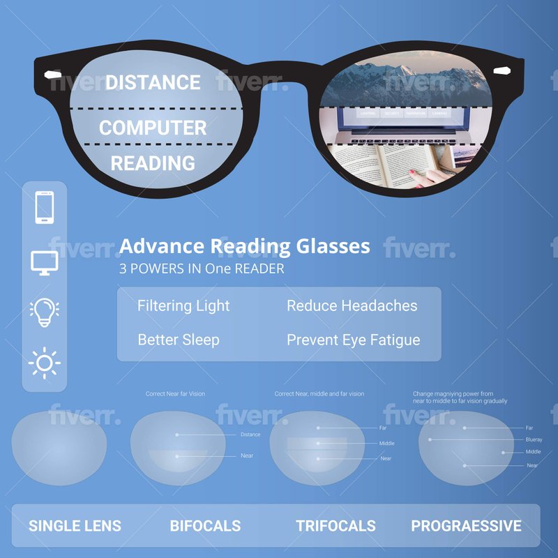 - Progressive lens with 3 powers in one pair (100%~50%)