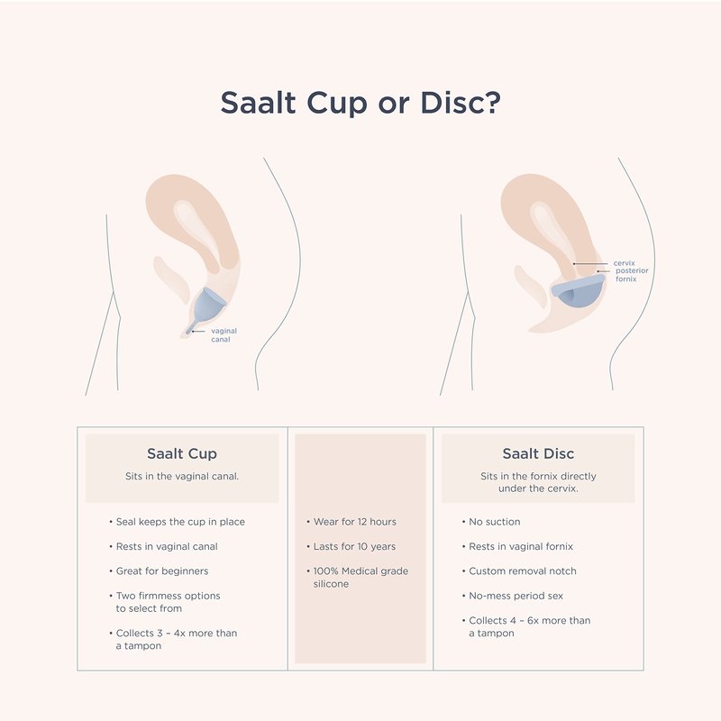 Better together. The Twin Pack was created at the request of our customers who were looking for a duo pairing that gave them the option to discover which firmness worked best for them during varying days on their periods. The Saalt Soft is a great option on days you have increased cramping and sensitivity. The Saalt Cup provides great coverage for your more physically active days. Our premium cups are made in the USA from 100% medical grade silicone with a velvety soft finish. A period cup is worn internally like a tampon, but collects‚ rather than absorbs‚ your period.