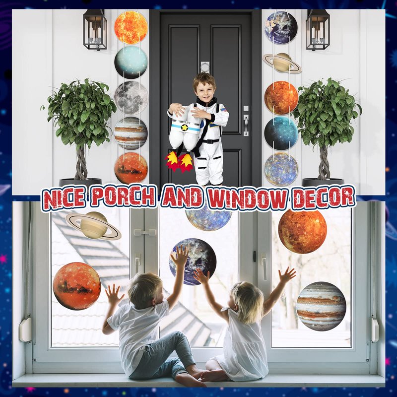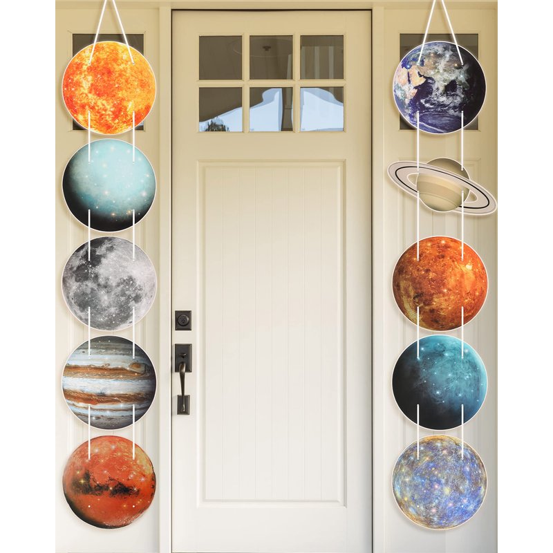 - Simple to Install: the outer space cutouts are equipped with 2 holes on the top and bottom, which are convenient for the ribbon to pass through, and you can adjust the distance between the cutouts according to your preference, then hanging them as banners, door signs or porch signs, also you can use the glue point dots to fix them on wall