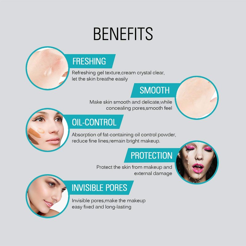 - CRUELTY-FREE FACE PRIMER MAKEUP. The primer kit is cruelty free. A silky gel emulsion rich in natural ingredients improves foundation or powder application, making them stay well in place.