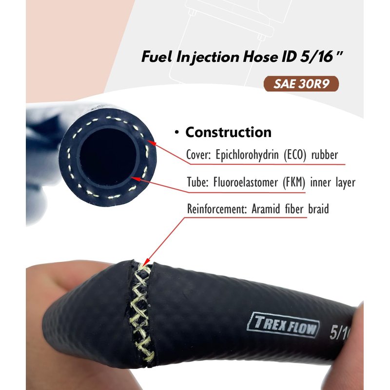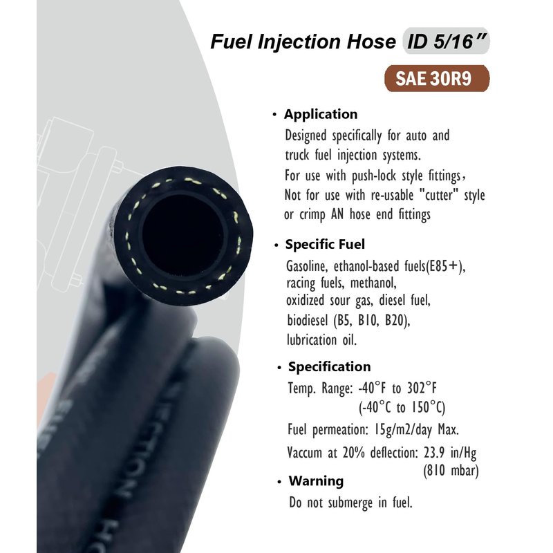 - [Feature:] Fuel injection hose 5/16 with inner Fluoroelasomer layer (FKM); Applicable with Gasoline, E85+, racing fuels, methanol, diesel, biodiesel B5, B10,B20, Lubrication oil, etc.