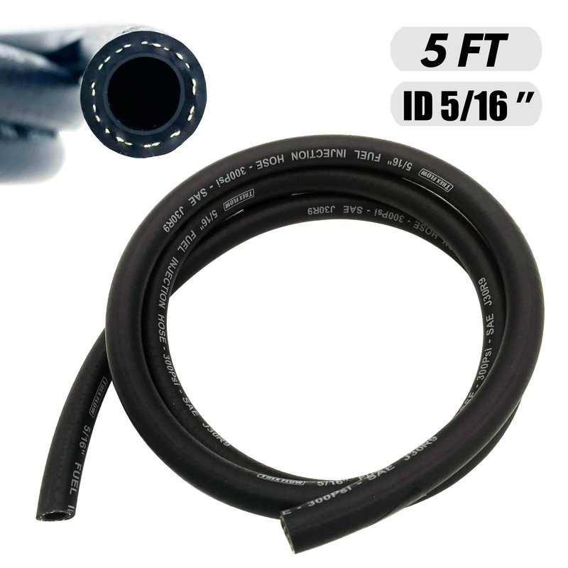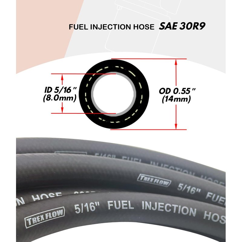 - [Spec.]: SAE30R9/SAE J30R9 rated fuel injection hose; ID 5/16" (8mm), OD 0.55" (14mm); 5FT Length, designed for fuel injection systems.