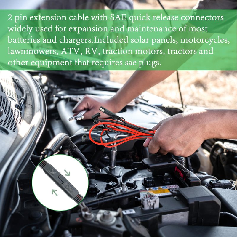 - [Wide Application]: For expansion of most batteries and chargers with SAE quick release connectors. Widely used in a variety of batteries, solar panels, motorcycles, lawn mowers, ATV, RV, traction motors, tractors and other equipment that requires SAE plugs. Enhance your power solutions with the SAE to SAE Extension Cable. Whether you're in the garage, at the campsite, or harnessing solar energy, giving you the freedom to tackle your projects with ease.