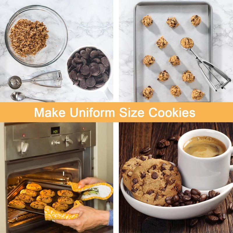 - HIGH QUALITY, SELECTED 18/8 STAINLESS - The cookie scoop for baking has gleaming surface, is made of food grade 18/8 stainless steel. We would be confident of strength, durability and food safety. These superior cookie dough scoop never contain harmful chemicals or others to leave into your food.