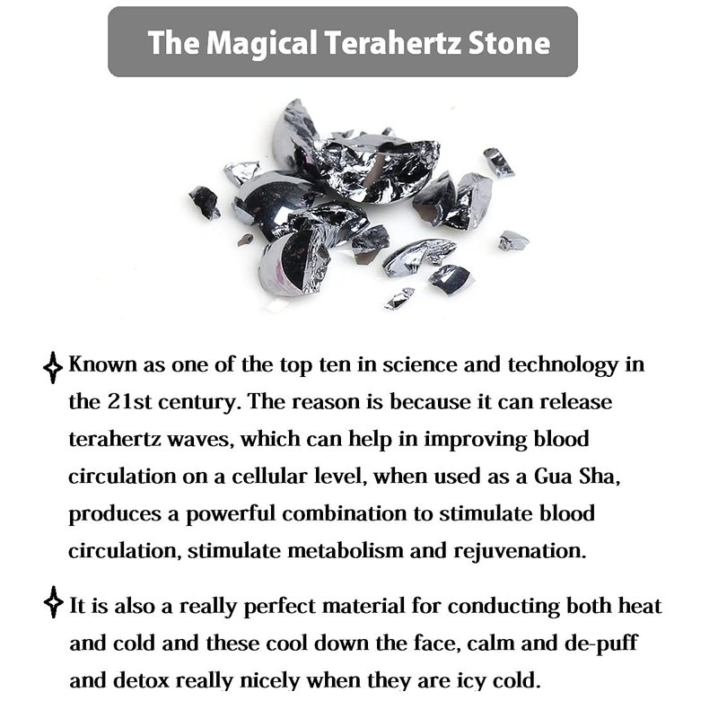 Terahertz Stone Gua Sha Where modern Japanese science meets ancient Chinese tradition. Combining the effects from terahertz stone and Gua Sha produce a powerful combination to stimulate blood circulation. Terahertz stone is a very powerful healing stone that possesses very high oscillating frequency as well as thermal conductivity.It can increase blood circulation and stimulate metabolism and rejuvenation.