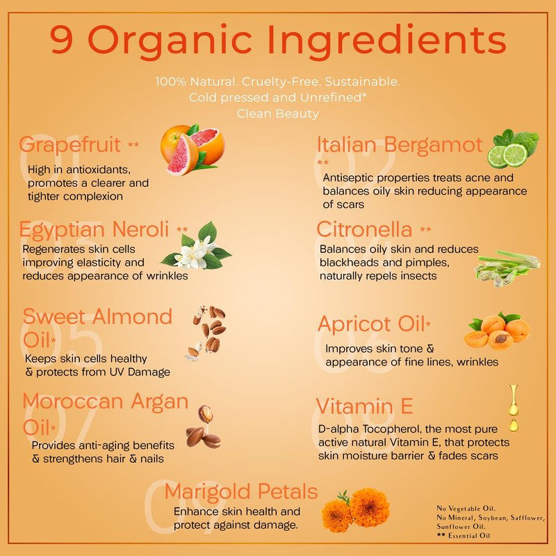- PLANT POWER: Citruse Oil is crafted from 100% pure plant extracts and phytonutrients. We avoid caprylic/capric triglyceride to prevent pore-clogging. Our ingredients are vegan, organic, and cruelty-free, free from parabens, phthalates, alcohol, and other harmful chemicals. Enjoy a natural, safe, and effective skincare solution that enriches and nourishes your skin.