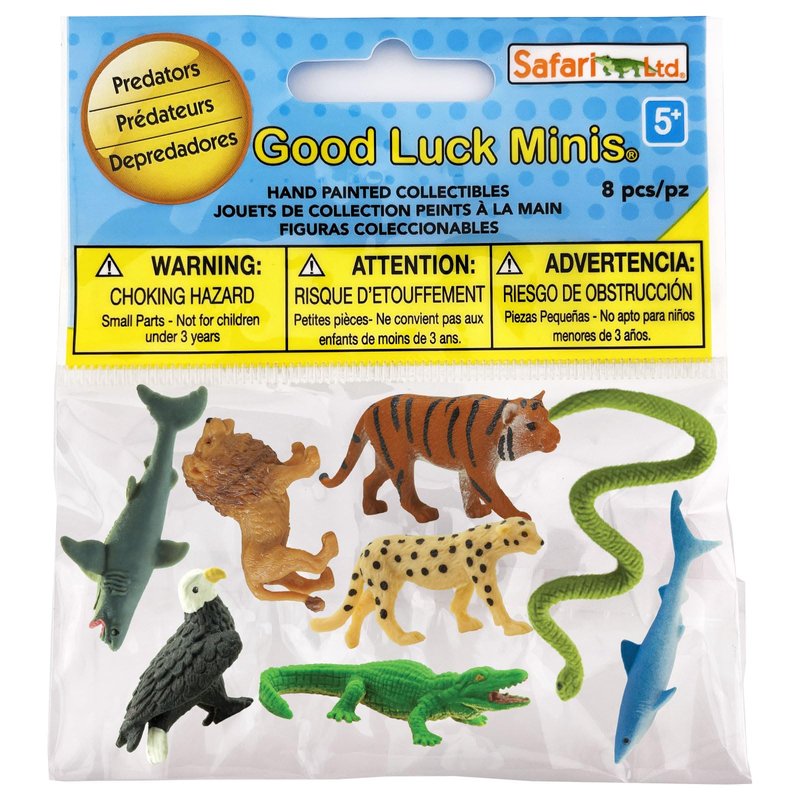 Enter the thrilling world of predators with the Safari Ltd. Good Luck Minis Predators Fun Pack! This captivating set includes 8 miniatures of some of the most fearsome hunters in the animal kingdom, from the mighty Great White Shark to the swift Cheetah. Predators play a vital role in maintaining the balance of ecosystems. Through hunting and feeding on other animals, they control populations and contribute to the overall health of their habitat. This Fun Pack provides an engaging way to explore this essential aspect of nature. Each predator is meticulously crafted to capture its distinct features and characteristics. Measuring an inch long and made with Non-toxic and BPA-free materials, these mini-figures are safe for children and offer endless possibilities for learning and creativity. Perfect for Montessori education, DIY projects, and party favors, these mini-figures provide hands-on learning experiences. Use them for counting, matching, or creating miniature dioramas to deepen understanding of these magnificent creatures. Contained in a 4-inch square bag, the Predators Fun Pack is easy to carry for on-the-go adventures. It's a perfect tool for teachers, parents, and children to delve into the exciting world of predatory animals and their critical role in our ecosystem. Whether exploring the stealth of the ambush predators like Alligators or the pursuit tactics of the Lion, this set fosters curiosity and appreciation for the complex interplay of life. The Safari Ltd. Good Luck Minis Predators Fun Pack is an ideal gift for young learners, animal enthusiasts, and collectors, providing a window into the world of nature's most awe-inspiring hunters. Unleash the excitement and discovery with these miniature marvels!