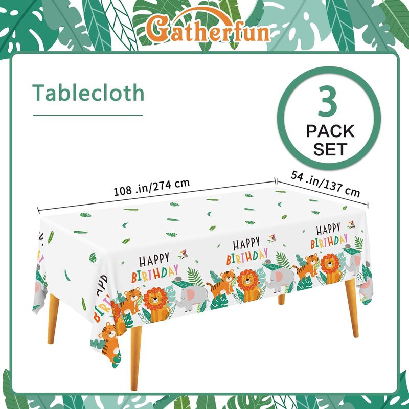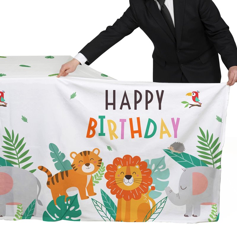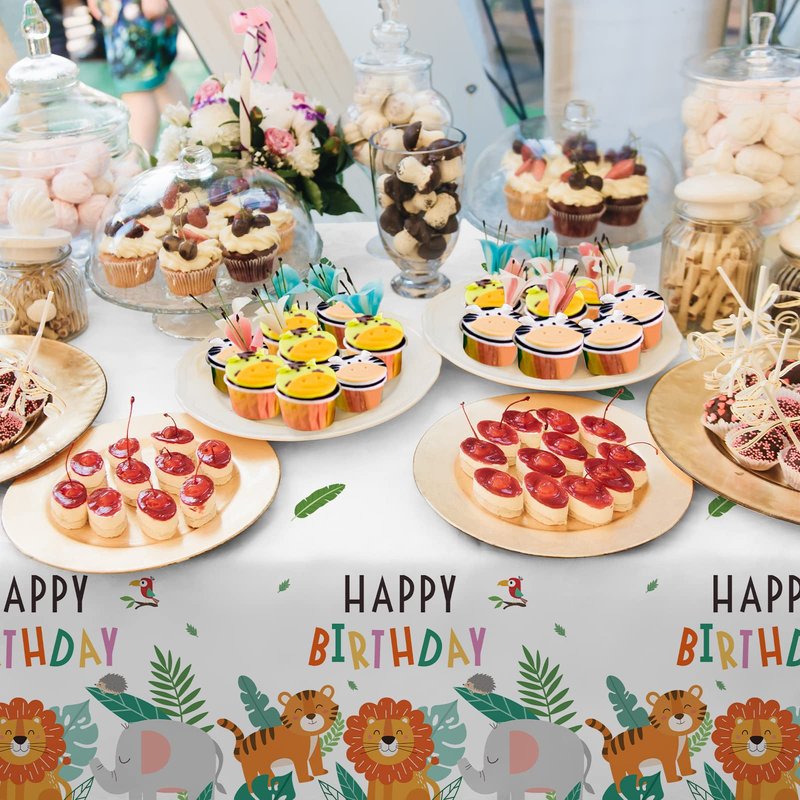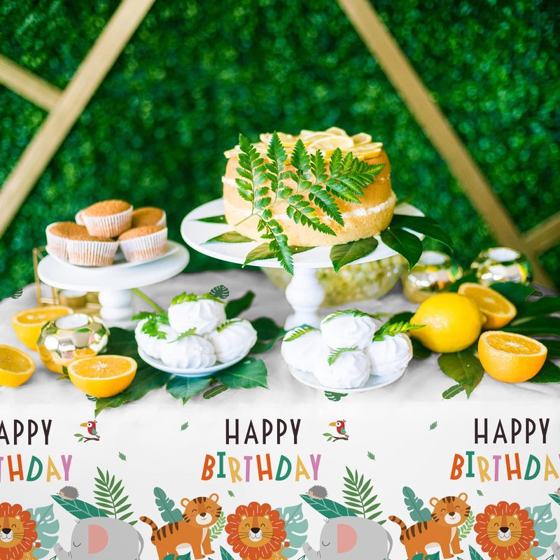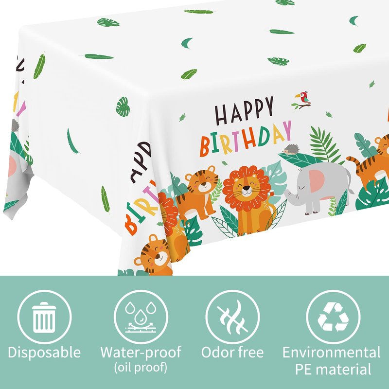 - The tablecloth feature a "Happy Birthday" message, plus a lion, tiger,elephant