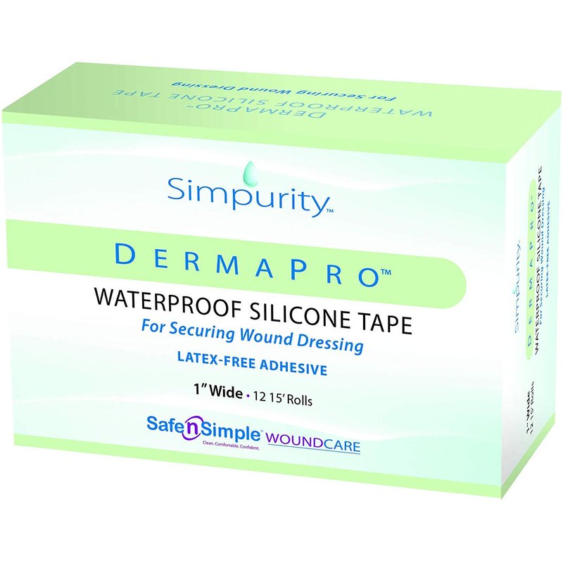 Simpurity DermaPro Waterproof Silicone Tape is latex free and has a silicone adhesive that is gentle to remove from sensitive skin areas. Superior for securing wound dressings and repelling moisture from outside contaminants. 1” rolls