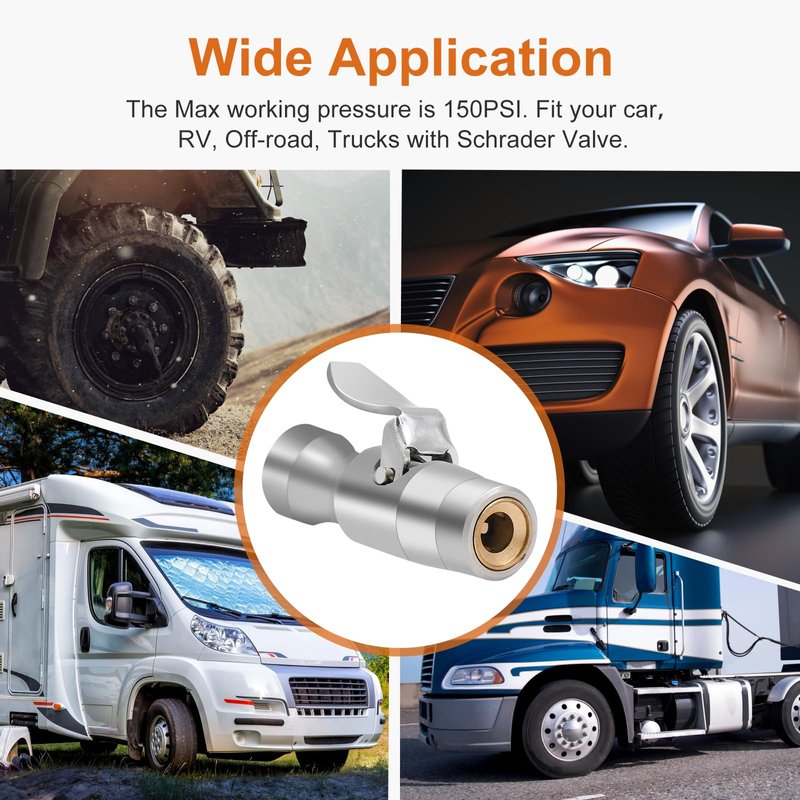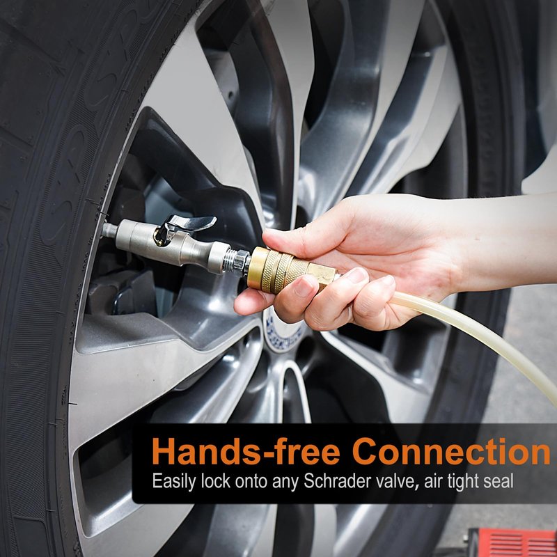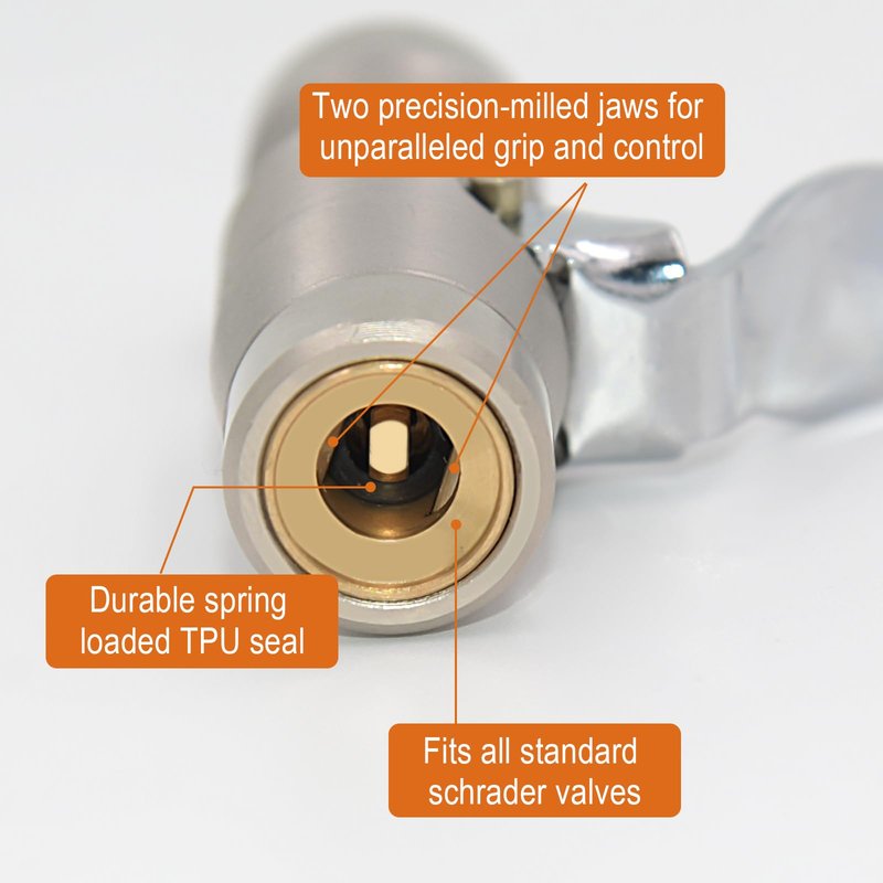 - CLAMPING LOCK-ON: two precision-milled steel jaws lock onto any Schrader valve for a secure, hands-free connection. Air tight seal, no more fighting the valve stem, no more air loss.