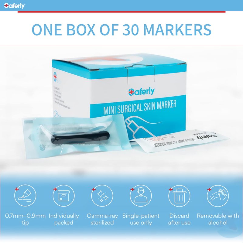 - ONE BOX OF 30 MARKERS – Use these surgical, body, and tattoo supplies for a worry-free application. Skin marker pens with 0.7mm–0.9mm tip. Remove the markings with alcohol and a gentle scrub.