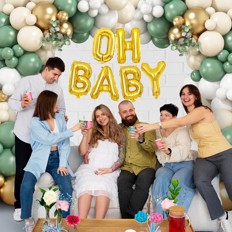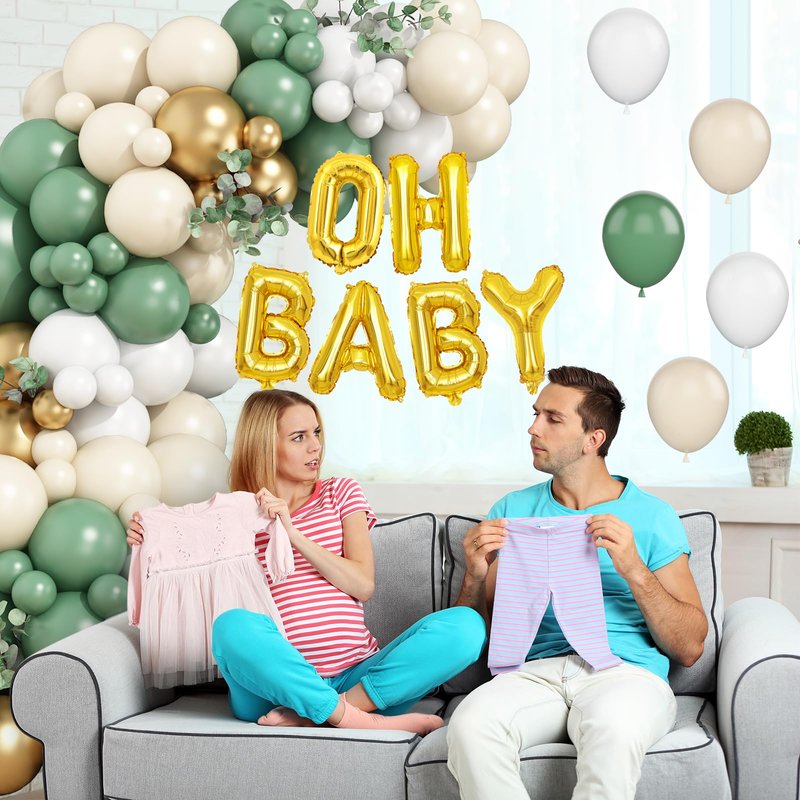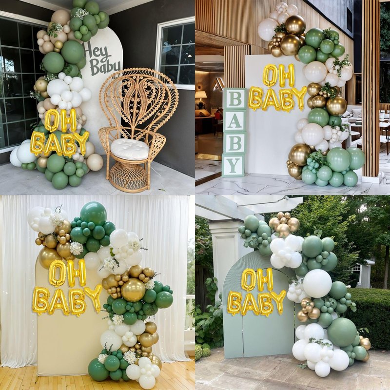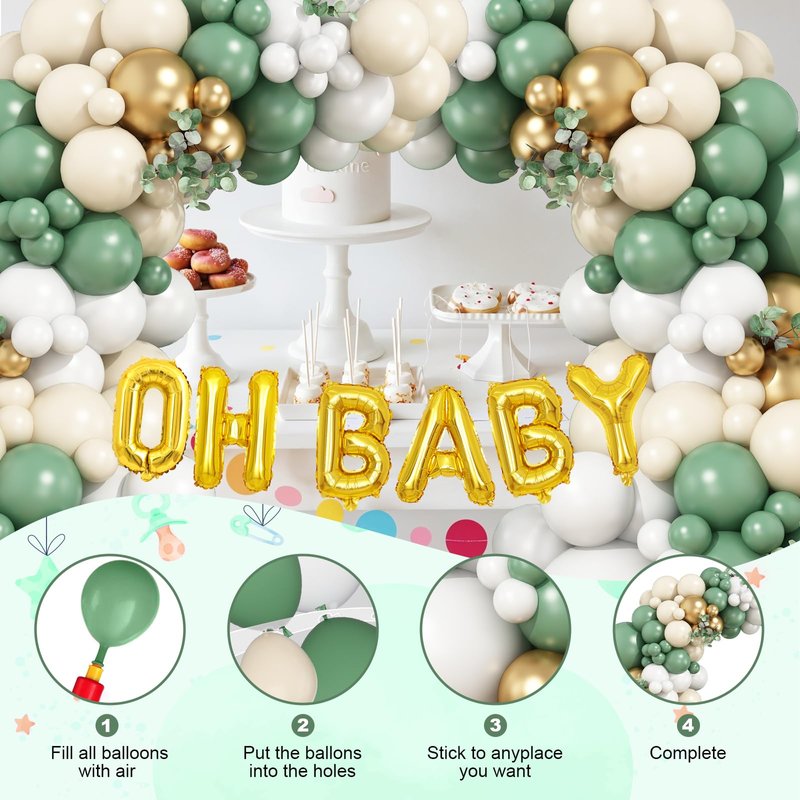 - Package Included: 46pcs sage green balloons balloons(5+10+18"),21pcs white balloons(5+10+18"),20pcs sand white balloons(10+18"),10pcs metallic gold balloons(5+10"),1pcs 16 Inch gold OH BABY balloon banner,glue points,balloon strip tape,ribbon.
