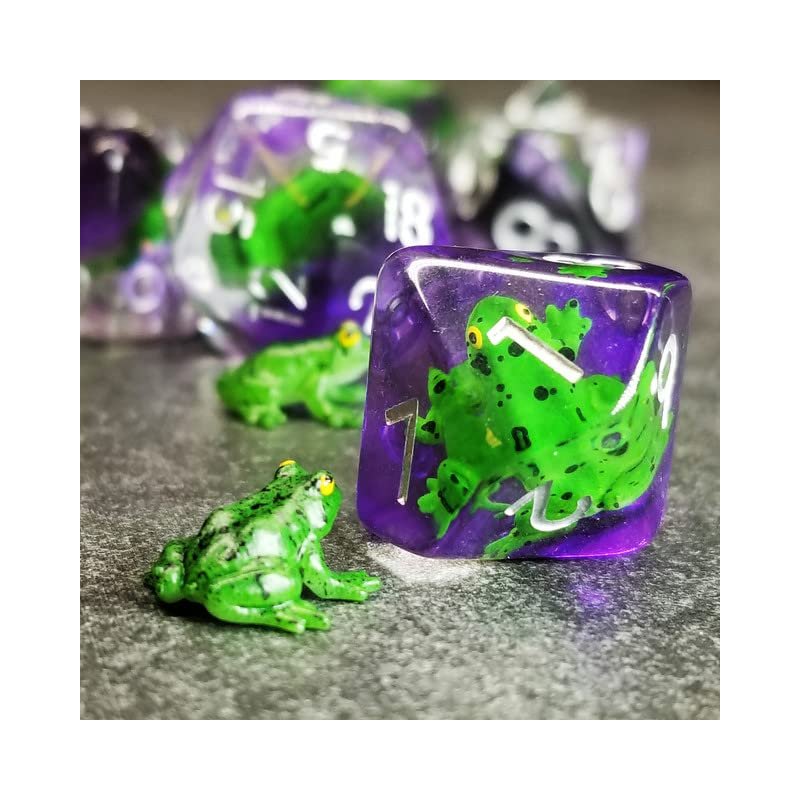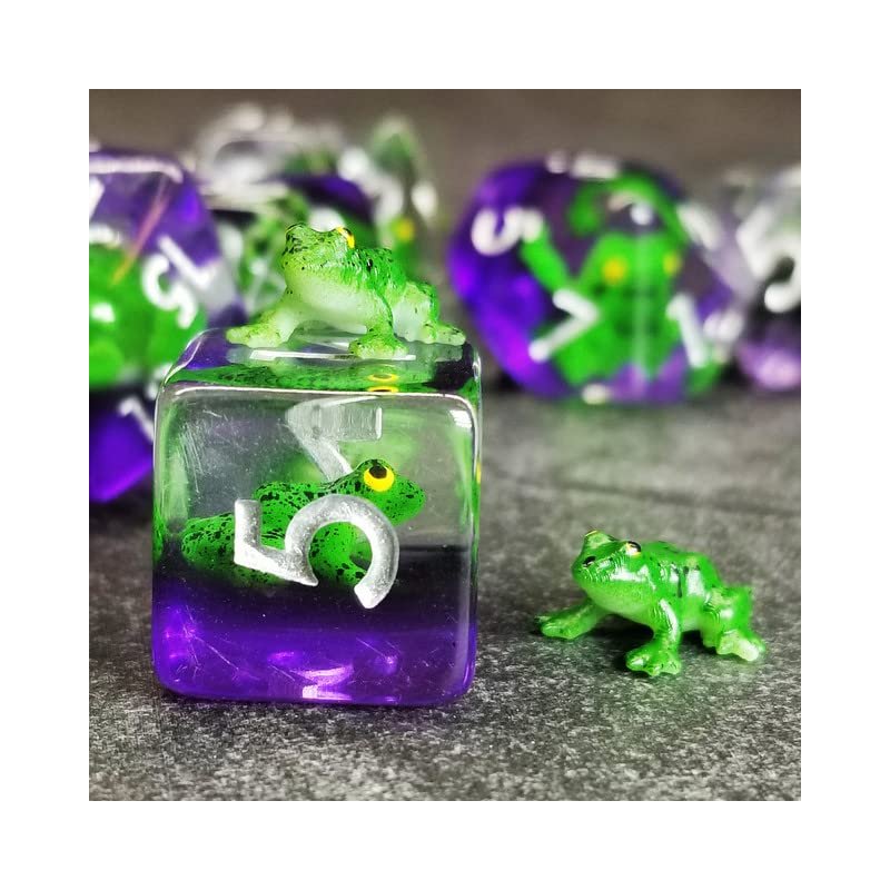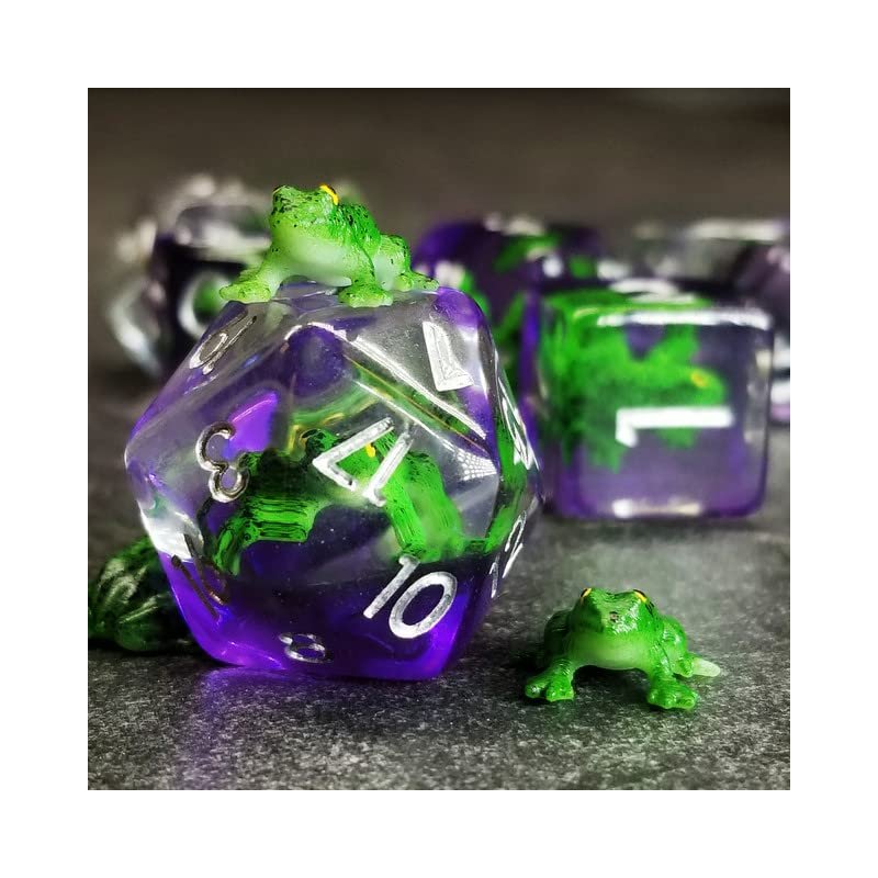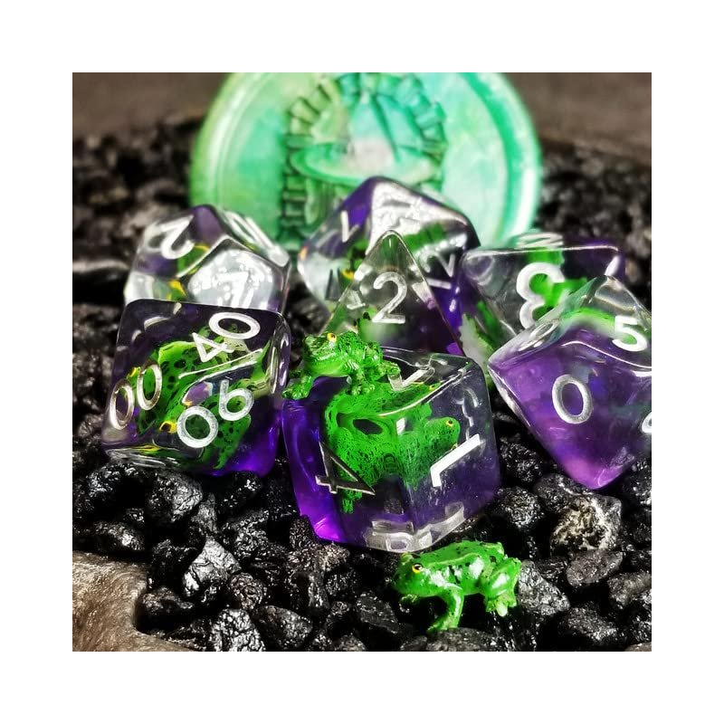 - Maximum Cuteness: Sage’s Green Frog Familiar Dice Set transparent/purple with green frog inclusion with and white ink.