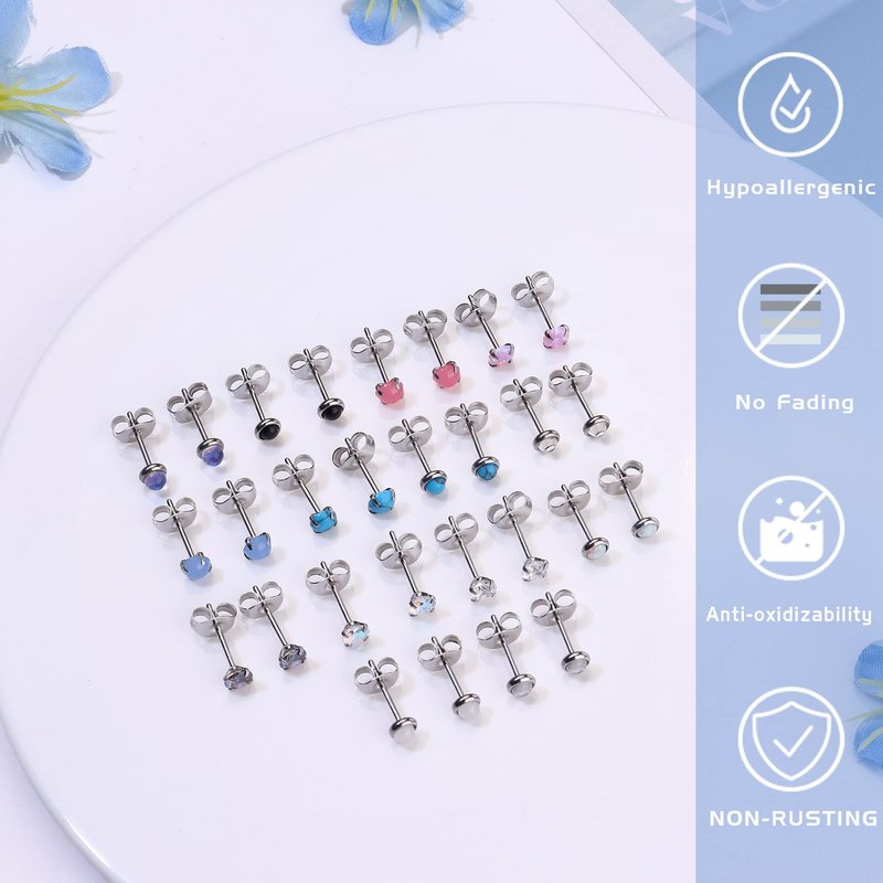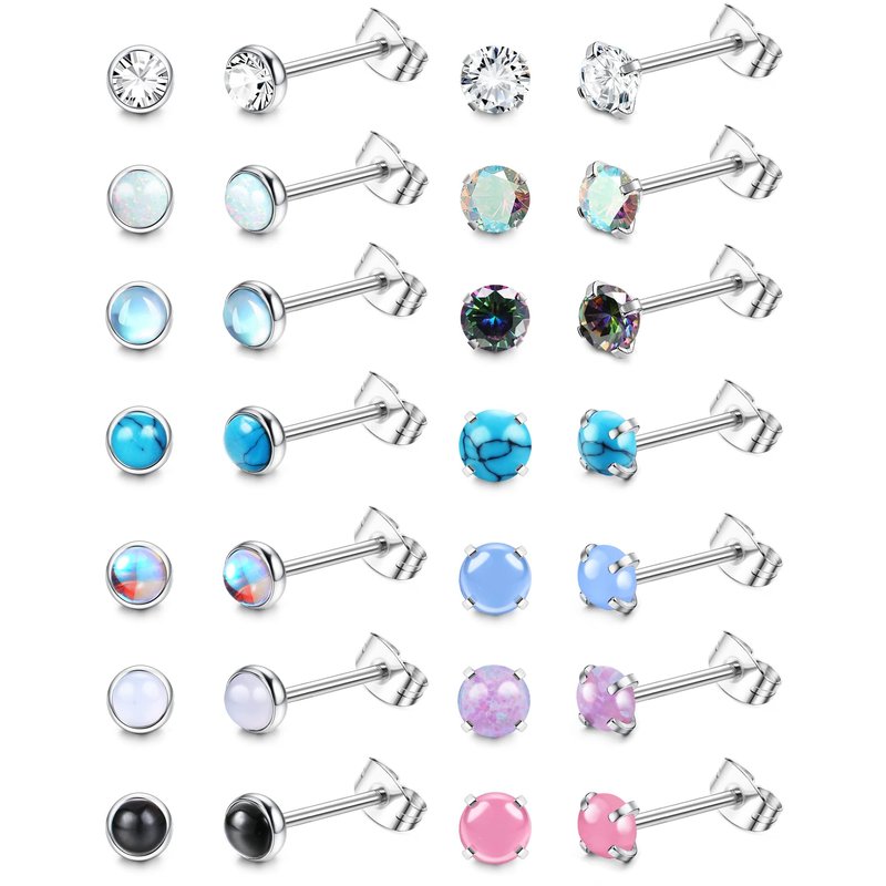 - 【Small Stud Earrings Set】Comes with 14 pairs hypoallergenic surgical steel stud earrings in a set, including opal earrings for women, cubic zirconia stud earrings, moonstone screw back earrings,turquoise stud earrings, etc.,a variety of designs to meet you and your daughter everyday wearing needs.