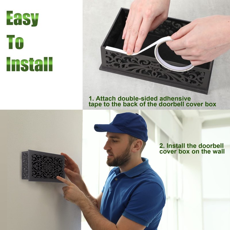 - Easy to Install: first method, you can just hang it to cover your doorbell, no need to drill a hole on wall or use screws; Second method, you can also stick the doorbell cover with the double sided adhesive tape that included in the package; Or you have some sticky glue to stick it on wall