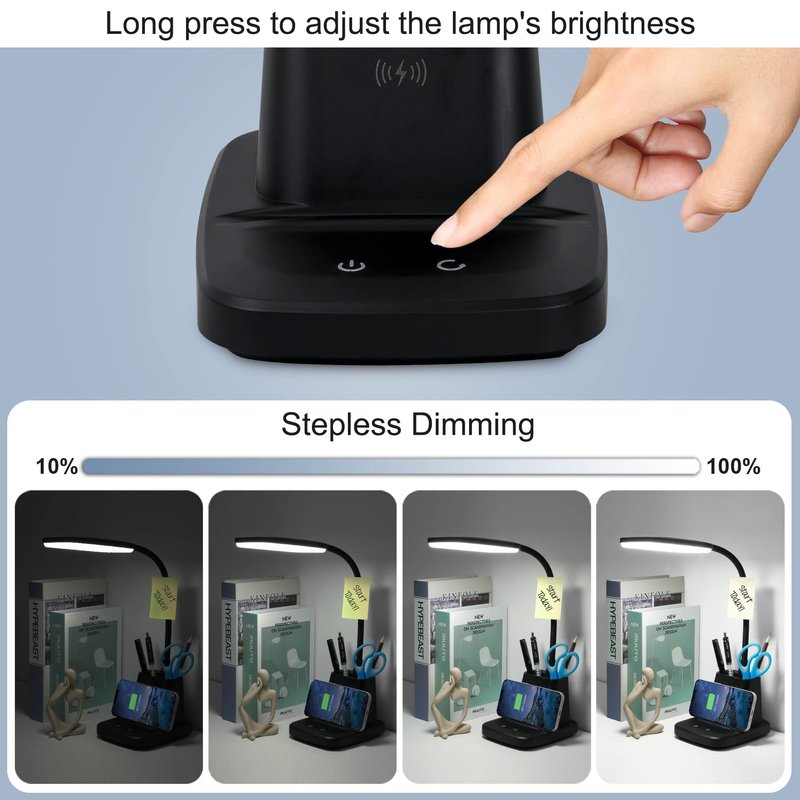 MORE THAN JUST A LED DESK LAMP 3-in1 Design Bring More Convenience If you love a clean and tidy desk space that is clutter-free, the Sailstar LED desk lamp is for you. It offers more than just illumination; it features a built-in pen holder for your pencils, pens, or glasses, and a convenient wireless charger that also doubles as a phone holder for your smartphone. The wireless charger has a 10W output to fast-charge all compatible smartphones and allows you or your kids to watch videos as your phone charges. It's a good choice for your dorm room, home office, reading area, kid’s bedroom, and even bedside table. A 360° adjustable gooseneck allows you to adjust the angle for optimum lighting. 3 Color Modes and Stepless Dimming Our LED table lamp provides up to 800 lumens of light and features 3 color temperatures to choose from; Soft Warm light (3000K), Cool Natural light (4000K), and daylight white (5000K). An LED illuminated touch control (that lets you find it even in darkness) and stepless dimming allow you to adjust the brightness between 5-100%. If that’s not convenient, we don’t know what is. More reasons to love our multifunctional LED desk light: · Uses high-quality LED lamp beads with over 50000 hrs lifetime. · Uses 20% less energy as incandescent bulbs saving you money in the long run. · A 5V/3A 1.8m adapter can charge the phone and power the light at max brightness. · Adjustable brightness and 3 color tones make this LED light gentle on your eyes. · Pen holder and phone stand combo makes this a practical desk lighting solution. · Unique design makes it an all-occasion gift for students, parents, and friends.