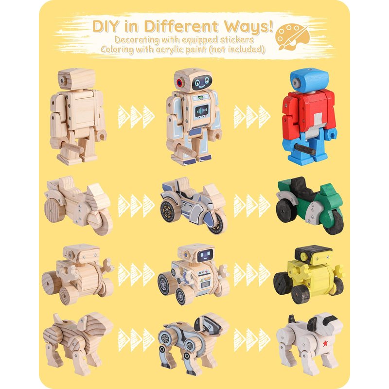 - STEM BUILDING KIT: Kids can enjoy 4 different woodworking toys at one time. The spin wheels and movable joints provide years of fun playtime. Complete creations bring a sense of accomplishment