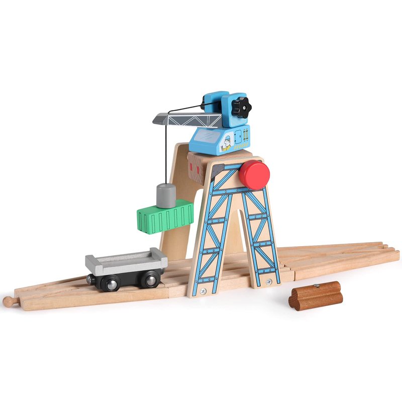 Elevate your train world playtime with our magnetic crane set. Rotating crane with retractable rope hoists magnetic cargo. Plus two wooden train tracks are compatible with all major brands. A must-have train accessory!