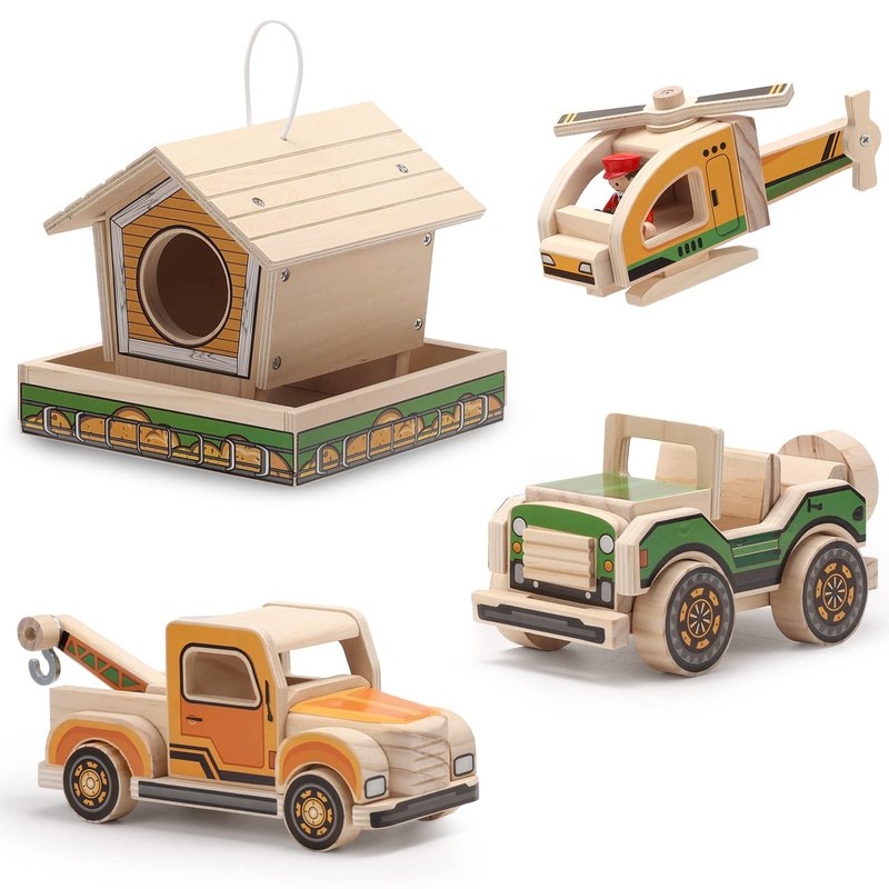 - 4-in-1 WOOD PROJECT: Included bird house, helicopter, off-road car, tow truck, kids can enjoy 4 different woodworking kits one time. After assembly, the finished toy is stable to play.