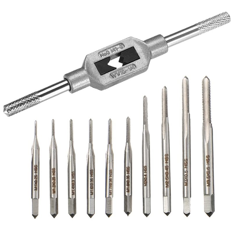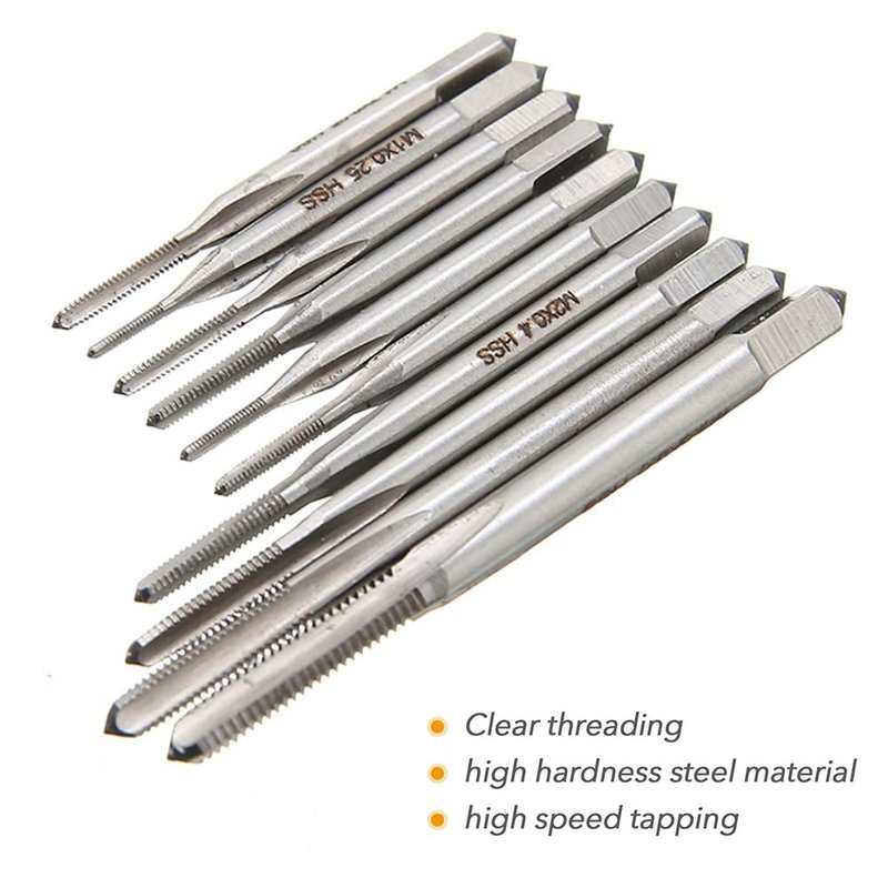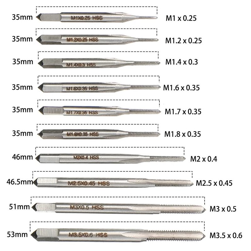 - 【10pcs Metric Tap Size】 M1 x 0.25, M1.2 x 0.25, M1.4 x 0.3, M1.6 x 0.35, M1.7 x 0.35, M1.8 x 0.35, M2 x 0.4, M2.5 x 0.45, M3 x 0.5, M3.5 x 0.6
