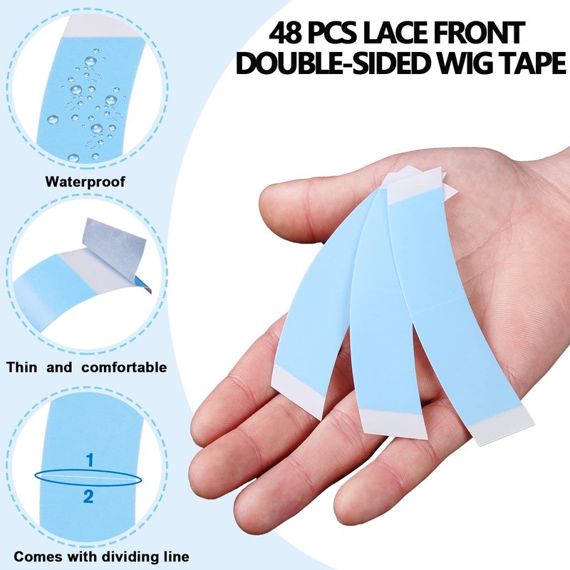 - 【Large quantit】: 48pcs blue lace wig tape , the quantity is enough for your daily use and sharing with family and friends, each piece is about 0.9 x 3.1 inches, which allows you to easily carry it with you anytime.And we also have blue, red, and white colors for you to choose from, which will bring you a different mood when you use it, and you don't have to worry about it. The tape used is transparent and has no color.