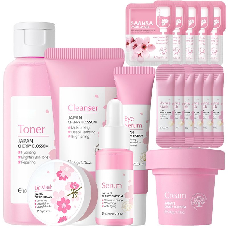 - [Sakura Skin Care Set]: These 11Pcs sakura face care sets include sakura toner, sakura facial cleanser, sakura serum, sakura eye cream, sakura lip mask, sakura face cream, 6* sakura sleeping mask, and 5 * sakura mud mask to help tighten skin, close pores, moisturize skin, and maintain skin elasticity