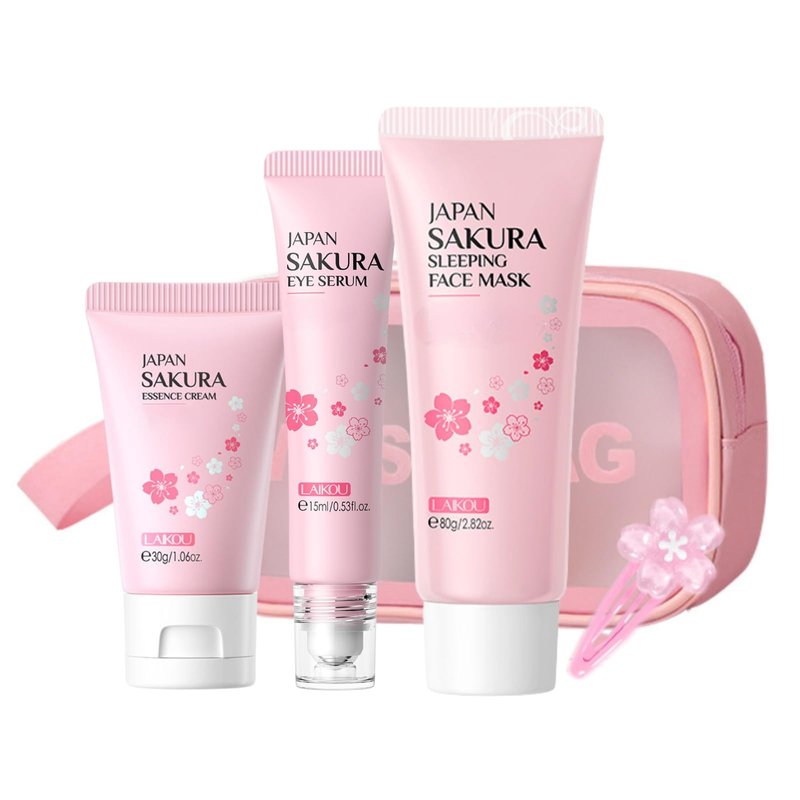 - 【Product Included in the Set】Our sakura facial skin care set includes an eye serum with a roller ball design for easy application,a luxurious sleeping face mask,a hydrating essence cream,a cute cosmetic bag for storage,and a lovely hairpin.This skin care kit is a comprehensive package for all your face skin care.