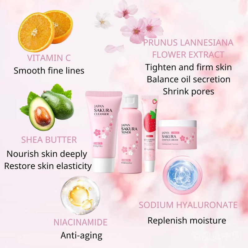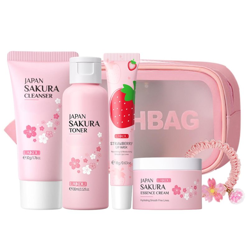 - 【Product Components】Our sakura skin care set is a comprehensive beauty and personal care package.This skincare set includes a gentle facial cleanser, a hydrating toner that's a must-have in any skin care kit, a nourishing lip mask, a rich essence cream, a cute hair tie, and a stylish cosmetic bag.It's the perfect combination of face care and beauty products.